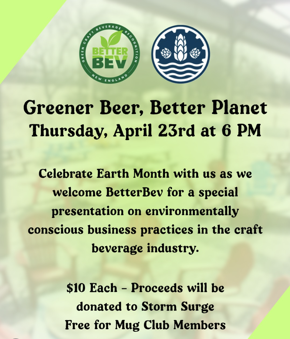 On Thursday, April 23 at 6:00 PM, Newburyport's own RiverWalk Brewing Co.—a family, community, and employee-owned brewery that has been crafting sustainable beers on Parker Street since 2012—is hosting Greener Beer, Better Planet, a special evening featuring a presentation by BetterBev on how breweries are reducing their environmental footprint, from sustainable ingredient sourcing to cutting water and energy use. In a wonderful gesture of community generosity, RiverWalk is donating 100% of ticket proceeds to Storm Surge, supporting our work to protect Newburyport's coastline and build a more resilient community. Tickets are available on Eventbrite. Join us for a fun way to learn about beer and to support Storm Surge.